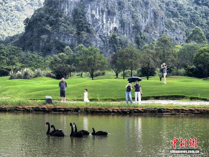 图为10月4日,游客在桂海晴岚景区拍摄黑天鹅。邓竣缤 摄
